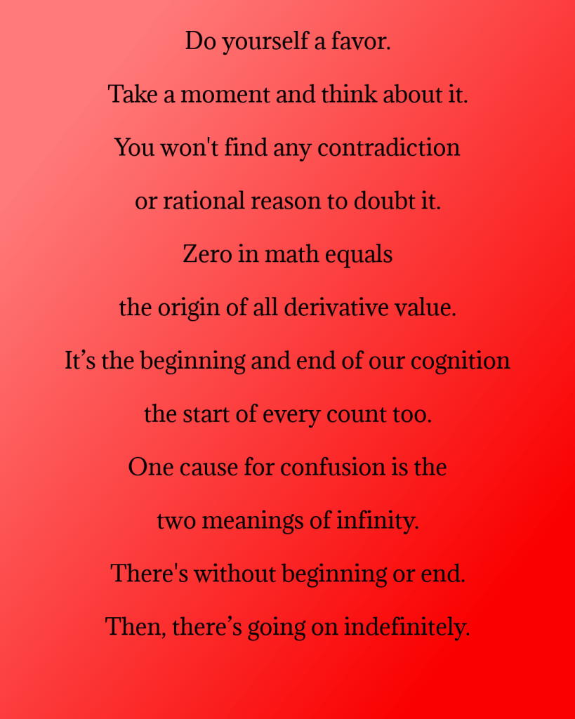 Don’t you know, whether you’re religious, atheist, or somewhere in between that rejecting the concept of zero relating to something real and unimaginable means you must reject or contradict something you claim to believe?