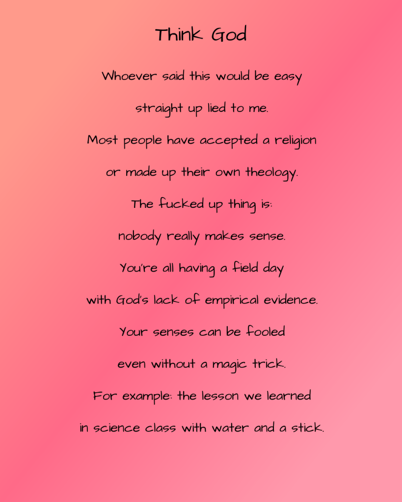 Now, for all of you who don’t believe God exists, whether you’re open to the possibility or not, I agree. The concept of God within religion contradicts itself way too much for any logical person to believe.