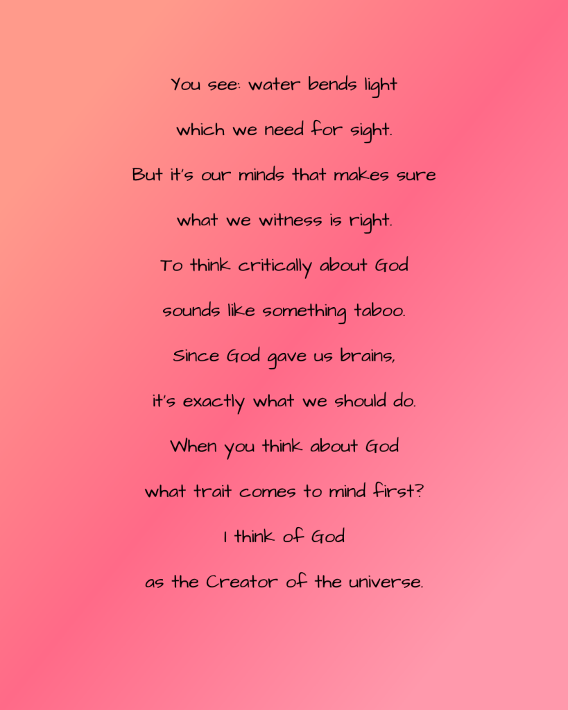 I thought about the Trinity. I didn’t think about it in the same way as the Christians. I saw the Father as the only God, the Creator. The Son was all physical or tangible creation and the Holy Spirit was the laws governing the entire universe. Who is this God that we can only experience through what has been created?
